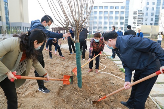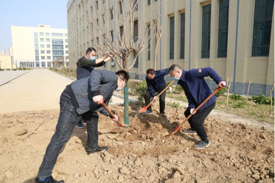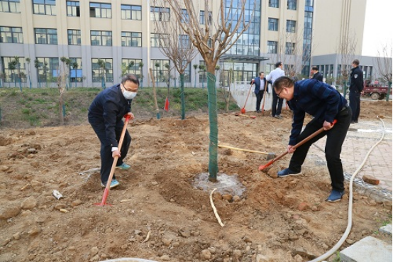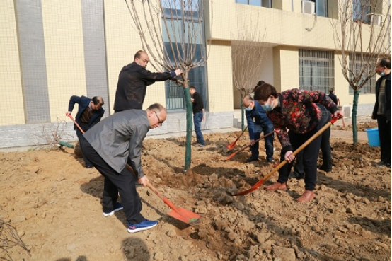 在植树的现场,挥锹铲土、培土围堰、提水浇灌,郭书记、朱校长种下樱花数棵。在和煦的春风中,挺拔的树苗青翠欲滴,初绽的枝叶迎风招展。参加植树的领导同志们同大家一起培土浇水,一片热火朝天的景象。