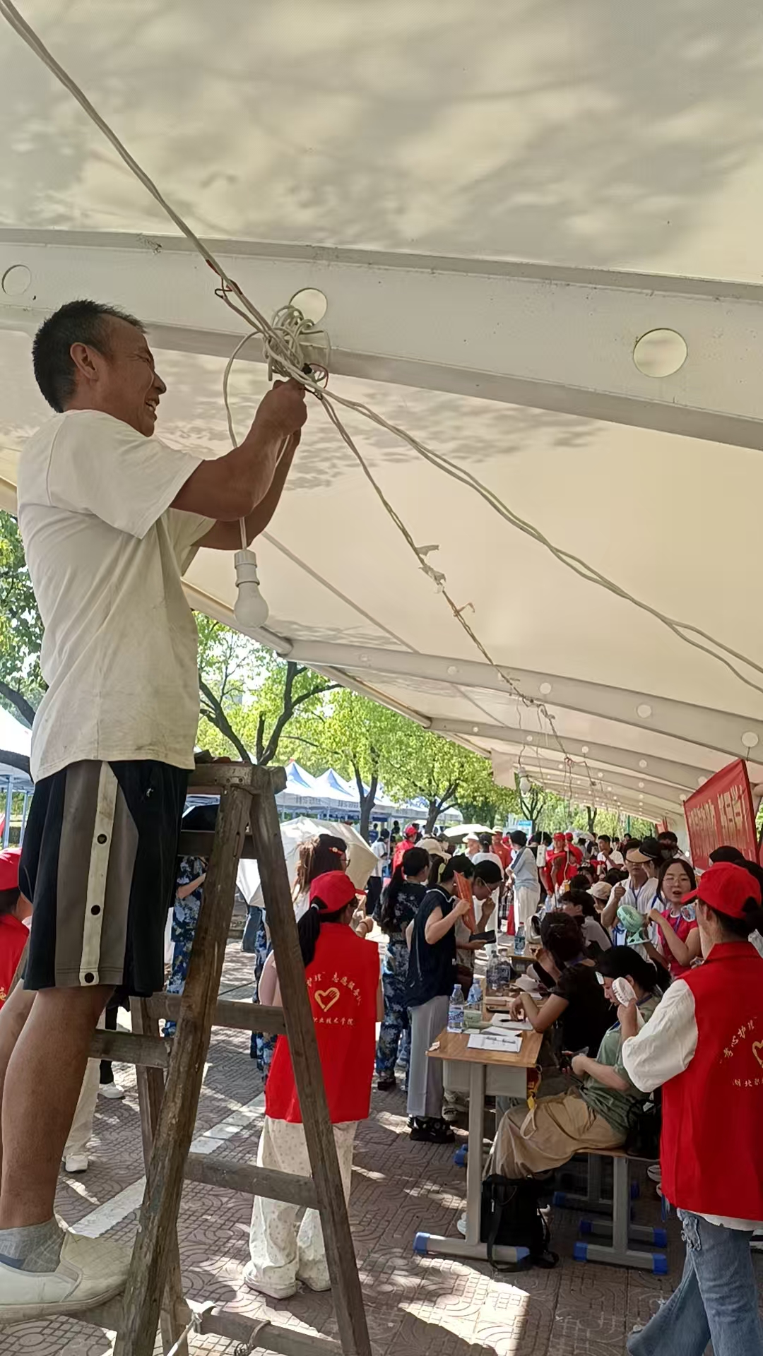对校园线路进行全面检修,为各校区迎新帐篷接通临时电源,安排专人值守,确保迎新帐篷内照明、风扇等用电需求稳定供应,给新生带来凉爽的同时确保各迎新点用电安全,为迎新工作顺利开展提供电力保障。