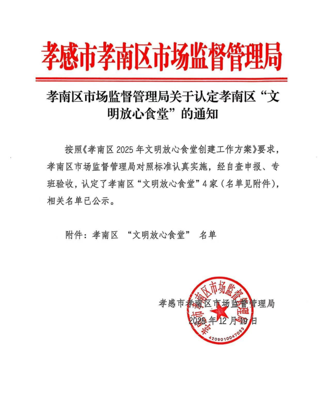 近日,孝感市孝南区市场监督管理局印发《关于认定孝南区“文明放心食堂”的通知》,我校美食广场、南区食堂、东区食堂凭借规范的运营管理、优质的服务保障、过硬的食品安全水平,成功获评“文明放心食堂”荣誉称号。
